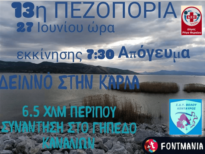 Σε απογευματινή πεζοπορία σας προσκαλούν το ΚΕΠ υγείας του Δήμου Ρήγα Φεραίου και ο Σύλλογος Δρομέων υγείας Βόλου «Κένταυρος» για μια γνωριμία με τη λίμνη Κάρλα.