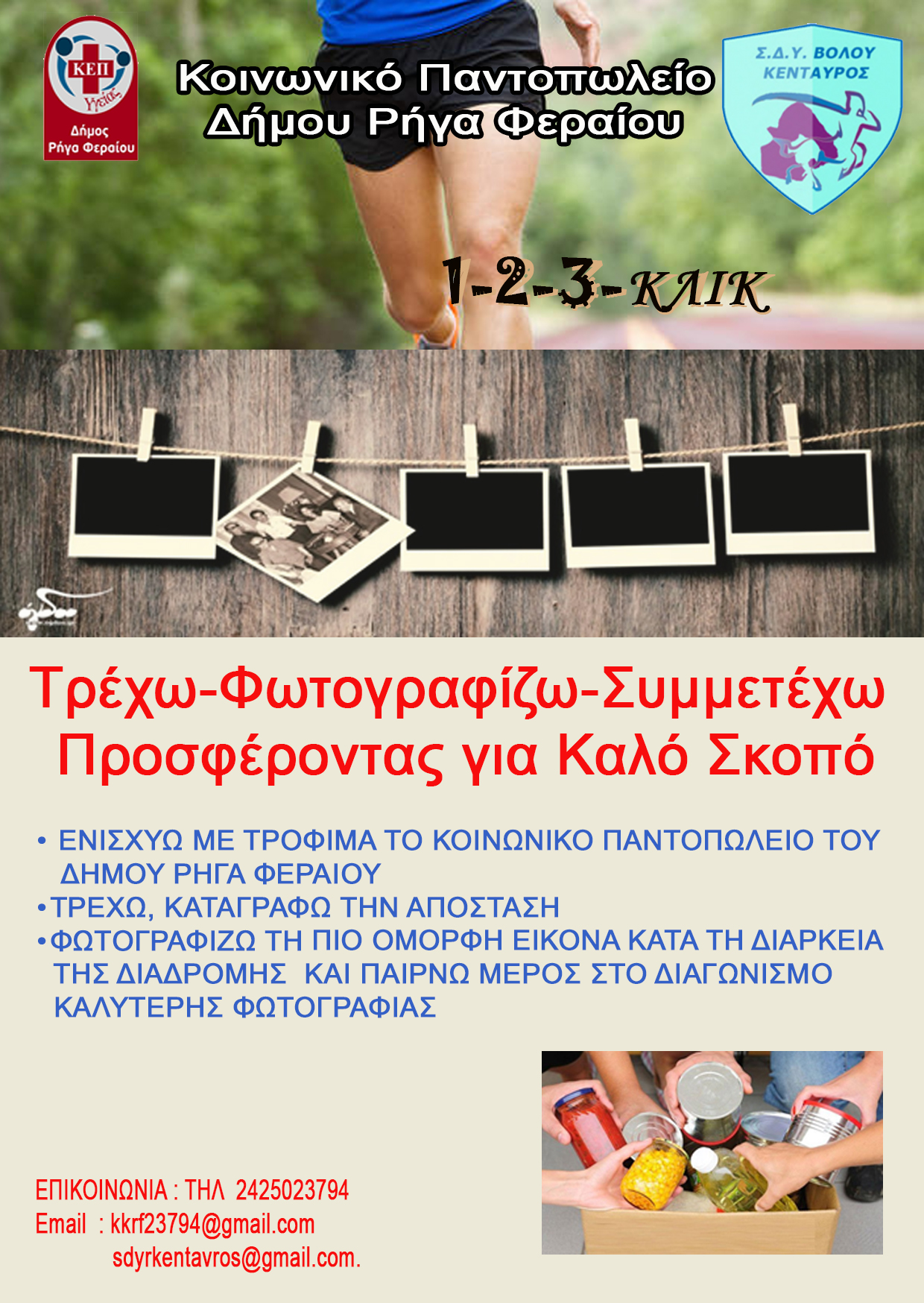 Το ΚΕΠ Υγείας του Δήμου Ρήγα Φεραίου με την υποστήριξη των Δρομέων του Κένταυρου – Βόλου διοργανώνουν μια αθλητική δραστηριότητα με φιλανθρωπικό, πολιτιστικό και κοινωνικό χαρακτήρα και σας προσκαλούν να φορέσετε τα αθλητικά σας παπούτσια, να καλύψετε τρέχοντας ή περπατώντας όποια απόσταση επιθυμείτε, να φωτογραφίσετε την πιο όμορφη εικόνα στη διαδρομή σας και να ενισχύσετε το Κοινωνικό Παντοπωλείο του Δήμου Ρήγα Φεραίου.