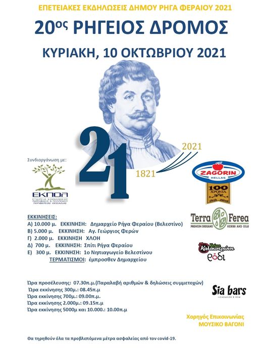 Ο 20ος Ρήγειος Δρόμος θα πραγματοποιηθεί την Κυριακή 10 Οκτωβρίου 2021 στον Δήμο Ρήγα Φεραίου ενόψει των επετειακών εκδηλώσεων του Δήμου για τη συμπλήρωση των 200 χρόνων από την Ελληνική Επανάσταση.