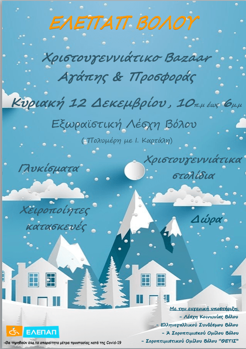 Χριστουγεννιάτικο Bazaar ΕΛΕΠΑΠ Αναρτήθηκε από τον/τηνsdyvkentavros11 Δεκεμβρίου 20216 Οκτωβρίου 2022Δημοσιεύθηκε στηνανακοινώσεις - νέα συλλόγου Τα γενναία παιδιά της ΕΛΕΠΑΠ αξίζουν τη στήριξή μας. Χριστουγεννιάτικο Bazaar την Κυριακή 12 Δεκεμβρίου στην Εξωραϊστική Λέσχη Βόλου. Κοινοποίησε το: Κάνε κλικ για να μοιραστείς στο X(Ανοίγει σε νέο παράθυρο) Χ Πατήστε για κοινοποίηση στο Facebook(Ανοίγει σε νέο παράθυρο) Facebook Μου αρέσει! Φόρτωση... Σχετικά