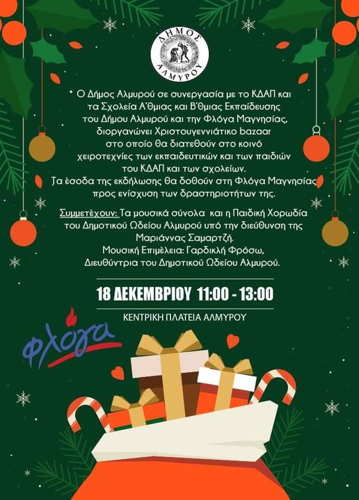 Χριστουγεννιάτικο bazaar το Σάββατο 18 Δεκεμβρίου στην κεντρική πλατεία Αλμυρού για την ενίσχυση της Φλόγας.![]()