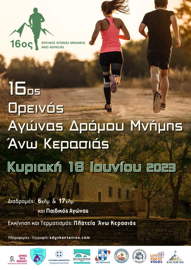 Ο Κένταυρος Βόλου, o Δήμος Ρήγα Φεραίου, η Περιφέρεια Θεσσαλίας, ο Πολιτιστικός Σύλλογος Κερασιάς, η ΕΠΦΑ Μαγνησίας και το Ultra Pelion Trail, υπό την αιγίδα της ΕΑΣ ΣΕΓΑΣ Θεσσαλίας, διοργανώνουν τον «16ο Ορεινό Αγώνα Μνήμης Άνω Κερασιάς» στις 18 Ιουνίου 2023 14 Μαΐου 2023. Πολύτιμες υπηρεσίες θα προσφέρει η Λέσχη Ειδικών Δυνάμεων Ν. Μαγνησίας και η LIFE GUARD VOLOS.