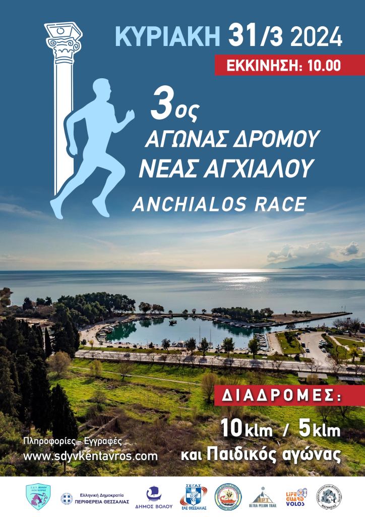 Ο Κένταυρος Βόλου συνδιοργανώνει με τον Δήμο Βόλου-Κοινότητα Ν. Αγχιάλου και την Περιφέρεια Θεσσαλίας, υπό την αιγίδα της ΕΑΣ ΣΕΓΑΣ Θεσσαλίας και με την υποστήριξη της ΕΠΦΑ Μαγνησίας και του Ultra Pelion Trail, τον 3ο Αγώνα Δρόμου Νέας Αγχιάλου την Κυριακή 31 Μαρτίου 2024, με διαδρομές 10χλμ και5χλμ και παιδικό αγώνα 500 μέτρων στην παραλία της Ν. Αγχιάλου. Πολύτιμες υπηρεσίες θα προσφέρει η Λέσχη Ειδικών Δυνάμεων Ν. Μαγνησίας και η LIFE GUARD VOLOS .