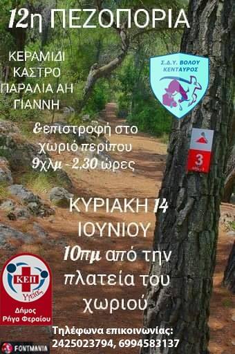 ΚΕΠ ΥΓΕΙΑΣ ΔΗΜΟΥ ΡΗΓΑ ΦΕΡΑΙΟΥ: ΠΕΖΟΠΟΡΙΑ ΣΤΟ ΚΕΡΑΜΙΔΙ ΚΥΡΙΑΚΗ 14 ΙΟΥΝΙΟΥ 2020 Το ΚΕΠ Υγείας του Δήμου Ρήγα Φεραίου, ο Σύλλογος Δρομέων υγείας Βόλου «Κένταυρος» με ξεναγούς τα μέλη του Περιπατητικού Συλλόγου «Αρχαία Κασθαναία» διοργανώνουν πεζοπορία την Κυριακή 14 Ιουνίου 2020. Ξεκινώντας στις 10.00 π.μ. από την πλατεία του χωριού οι συμμετέχοντες θα έχουν τηνΣυνέχεια ανάγνωσης «ΠΕΖΟΠΟΡΙΑ ΣΤΟ ΚΕΡΑΜΙΔΙ»